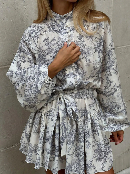 Printed V-Neck Ruffled Cap Sleeve Dress